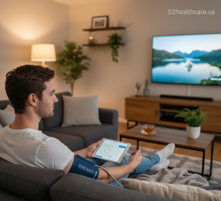 Ready to experience a simpler way to manage your health? With s2healthcare.us Remote Patient Monitoring, you don’t have to put your life on hold for your health. Like the patient watching TV in the image above, you can effortlessly track your vital signs and health data from the comfort of your couch, seamlessly integrating care into your daily routine. Stop scheduling stressful, disruptive office visits for routine checks and start receiving proactive, personalized support directly from your home. Get started with s2healthcare.us RPM today and take control of your well-being without losing your peace of mind.